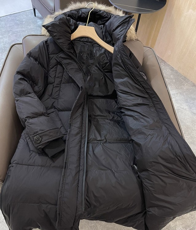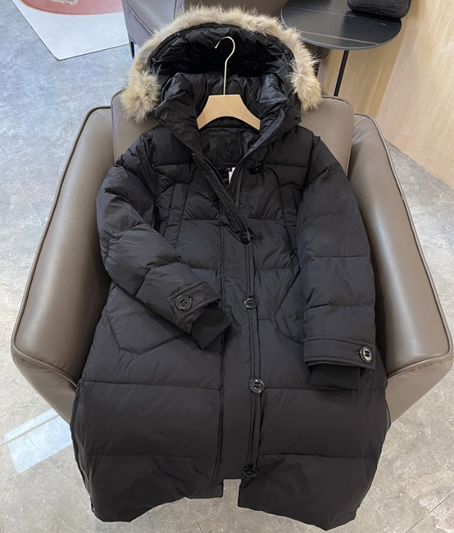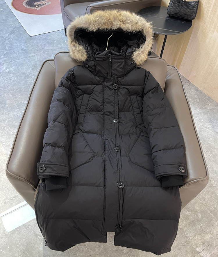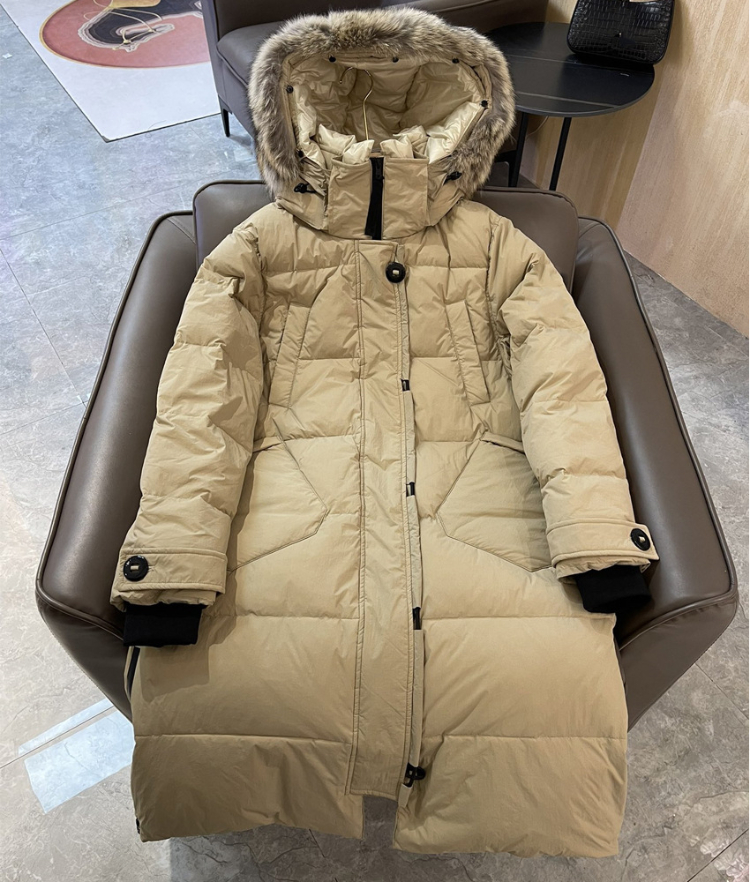 Thick and warm long down jacket with goose embroidery badge and hood-5343
