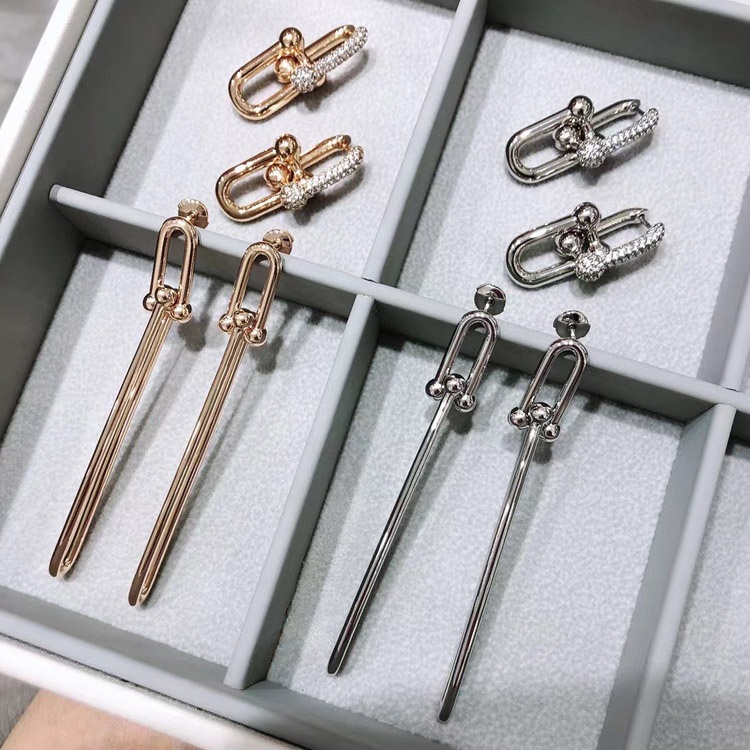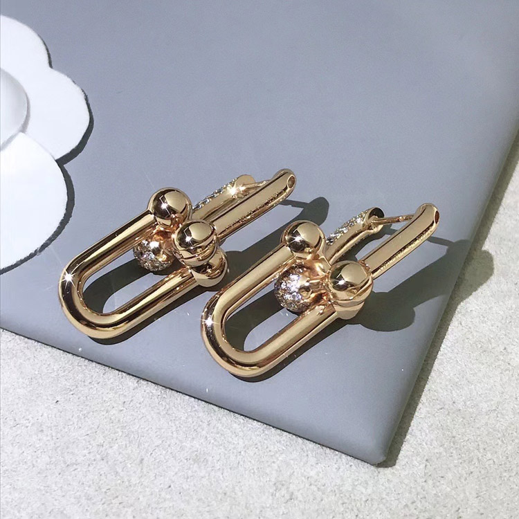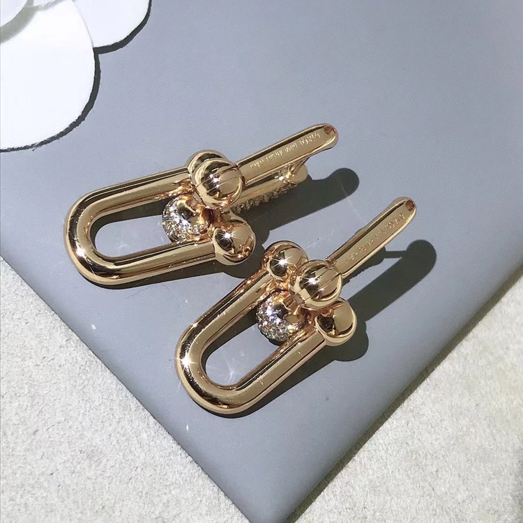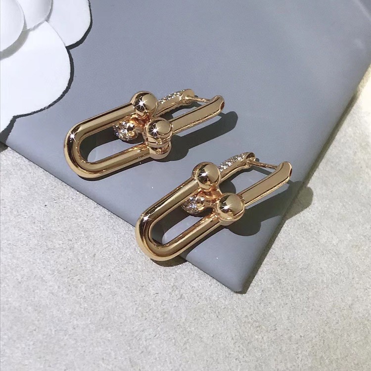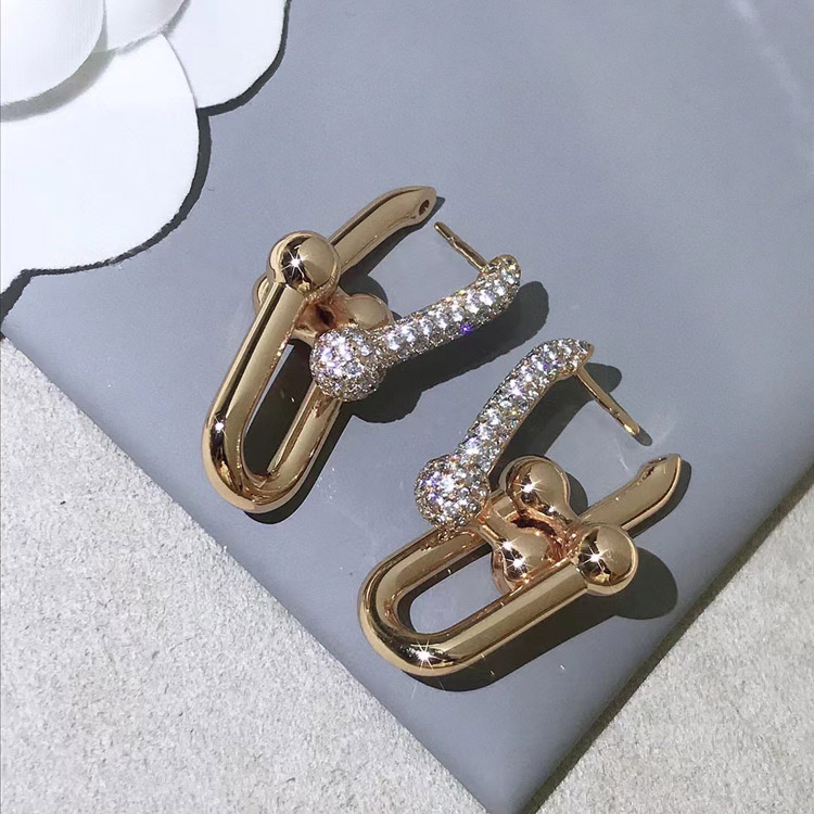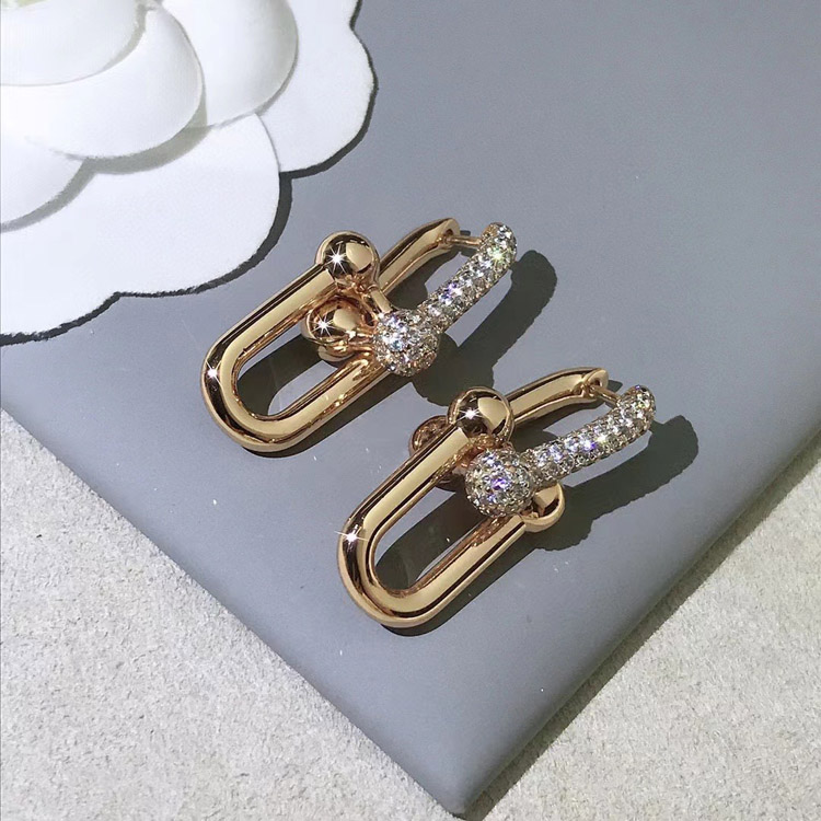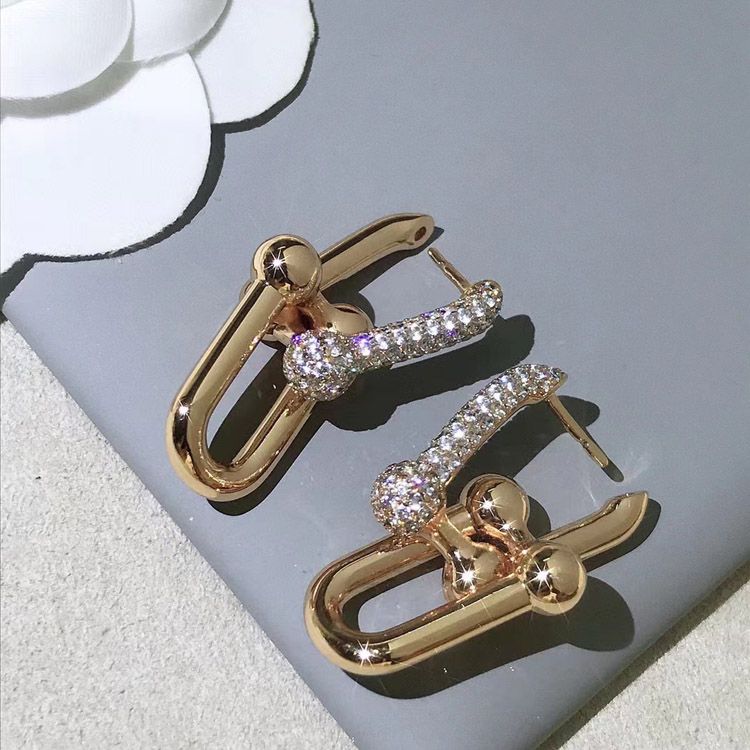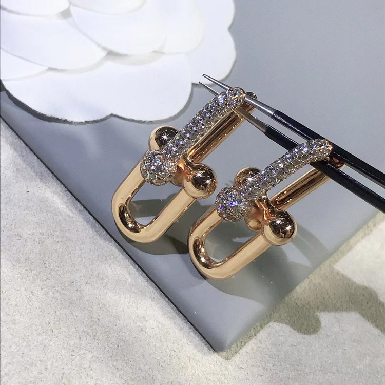 Tiffany rose gold diamond double ring horseshoe buckle earrings-3678
