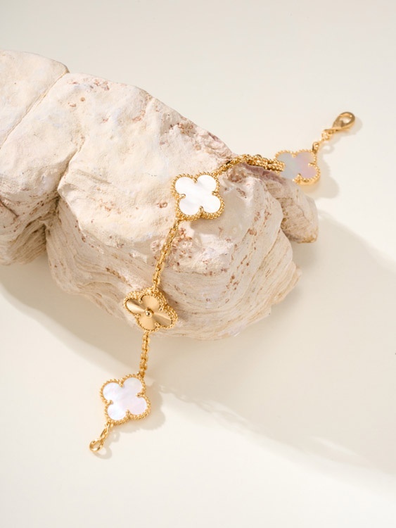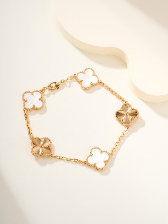 Van Cleef & Arpels White Mother-of-Pearl Gold Five-Flower Four-Leaf Clover Bracelet-3758